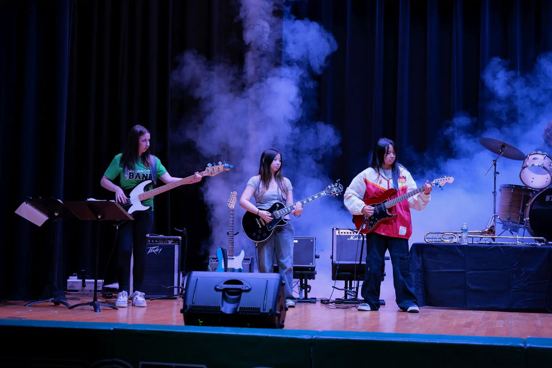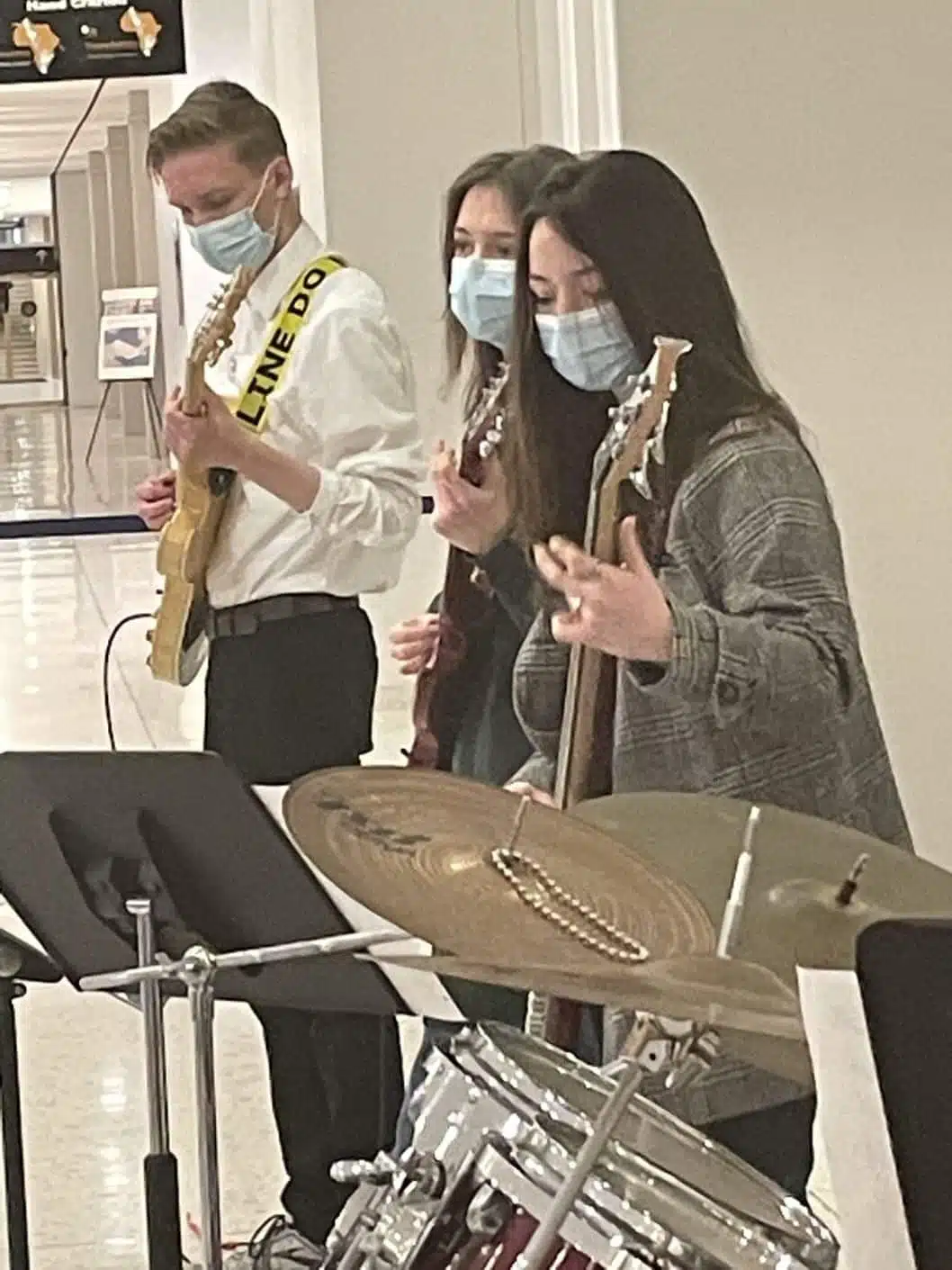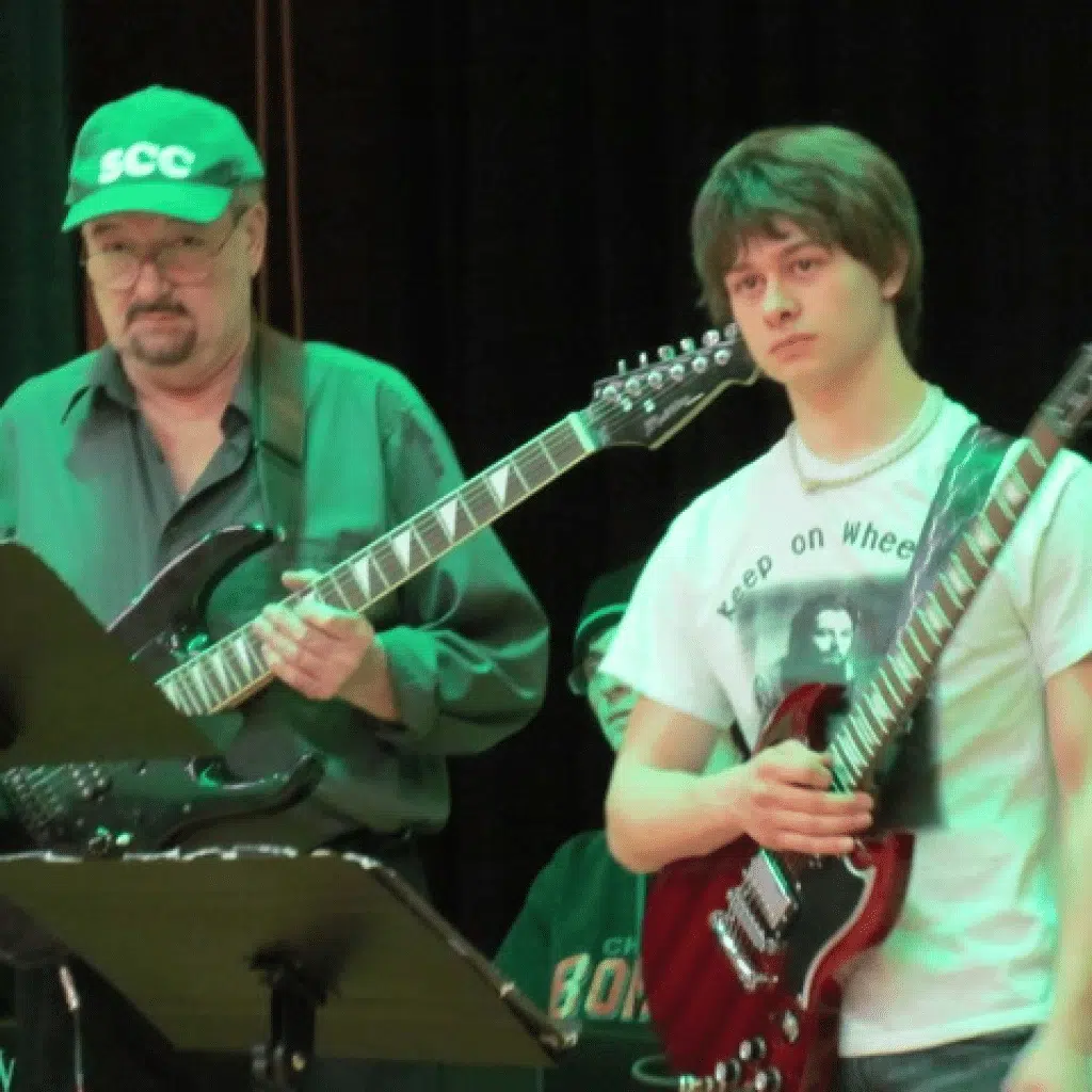 Modern Music Ensemble (Stage Band) guitars and bass performing at the Empire State Plaza in Albany, NY; March 23, 2022